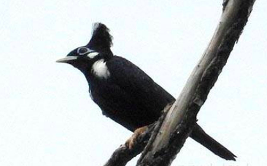 Head and neck: Long feathers on crown forms a tall crest; head and throat black with iridescent purple; white patch on lower ear coverts; eye brown; bill light yellow.