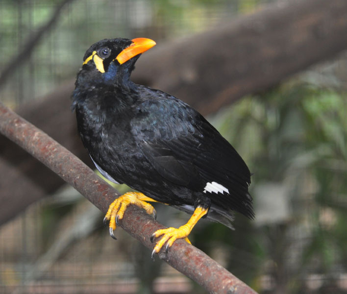 Head and neck: black with iridescent green purple; bare skin below eye and wattles on nape yellow; eye dark brown; bill reddish orange, yellow on tip. Body: Overall black with iridescent purple green; middle of primaries white forming a wing patch. Limbs and tail: Legs and feet brownish yellow; tail black.