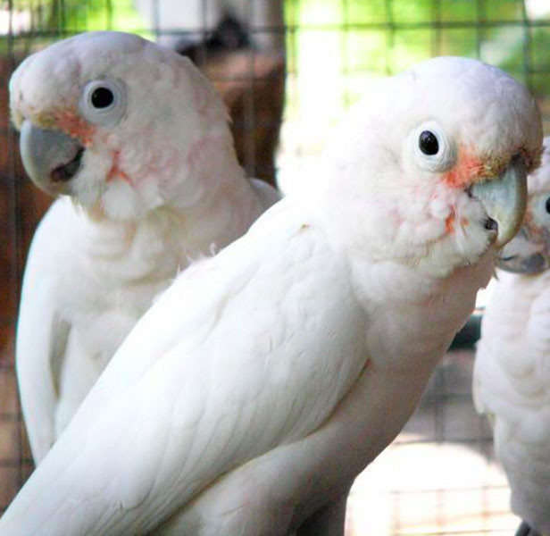A small cockatoo; 30-32 cm TL; 300 g; sexes alike in appearance; female slightly smaller in size. Head and neck: pink on lores (in front of eye); head white; eye brown (male), reddish brown (female); skin around eye pale blue; ear coverts light brownish orange; bill greish blue at base with light yellowish tip