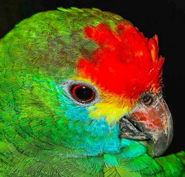 Head and neck: Forehead bright red; crown bluish green; nape bluish green or green; throat bluish green; bill yellowish grey.