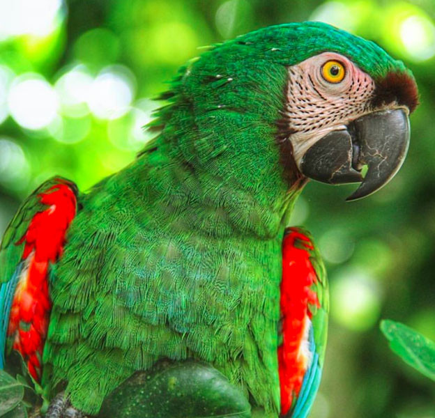 Body: Overall green; shoulder with narrow red; primaries turquoise blue.