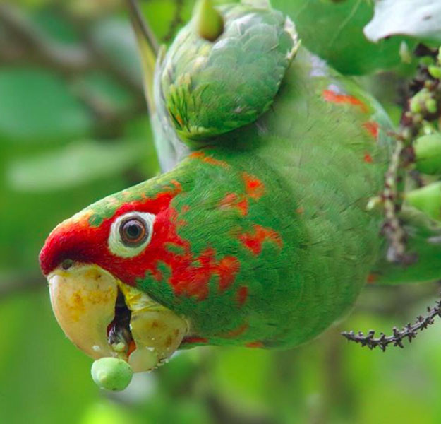 Head and neck: Forehead and around eye red; cheek and ear coverts may be covered with red flecks; nape and throat green; skin around eye white; bill light yellowish brown.