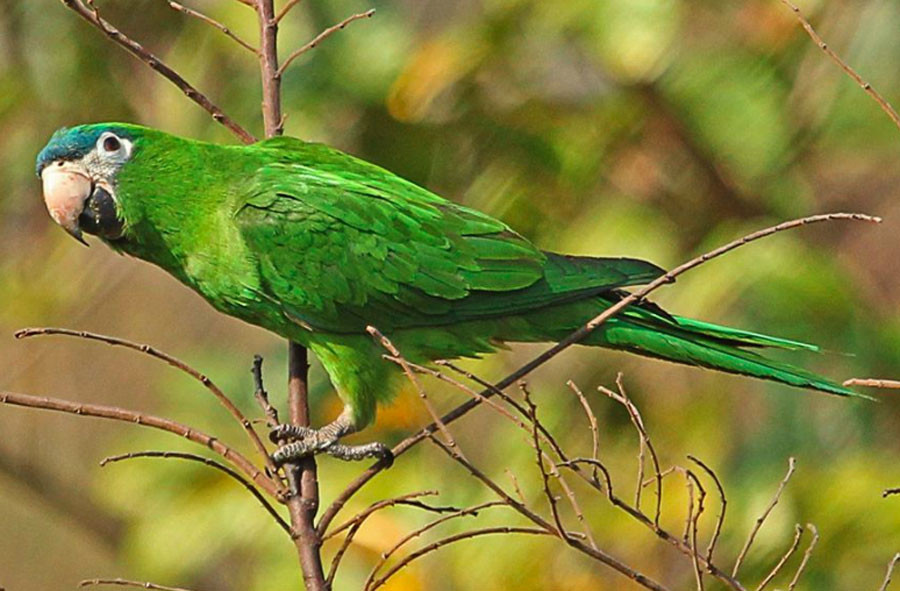 Head and neck: Forehead turquoise blue; bareskin on face white; nape and throat green; upper bill dirty white or dark grey with whitish spot near base; lower bill dark grey.