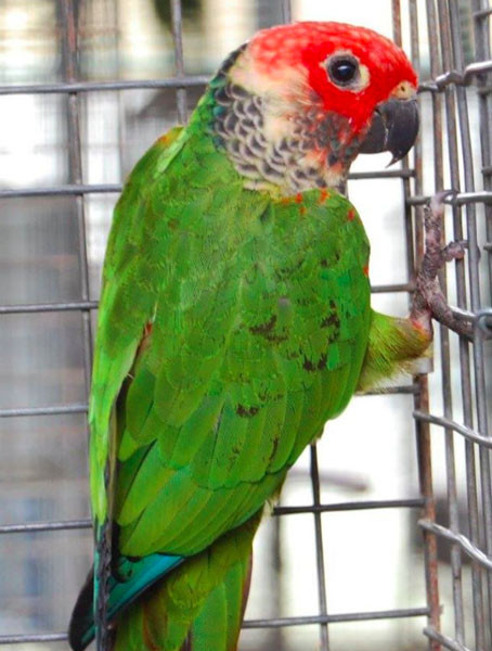 Head and neck: Head bright red; ear coverts greyish or yellowish white; nape grey; side of neck and throat grey with white edges (scalloped pattern); skin around eye white; eye brown; bill black.