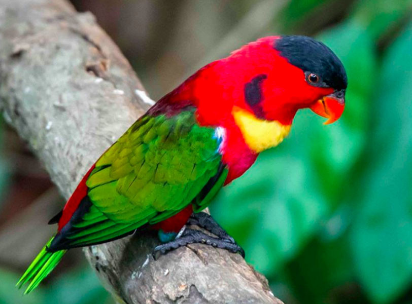 Limbs and tail: Legs and feet dark grey; thigh coverts blue; tail coverts red; tail red with green tip; undetail yellow.