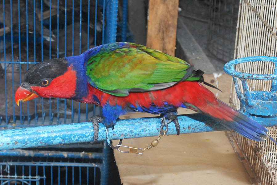 Head and neck: Crown black; head and throat red; nape purplish blue; bill orange.