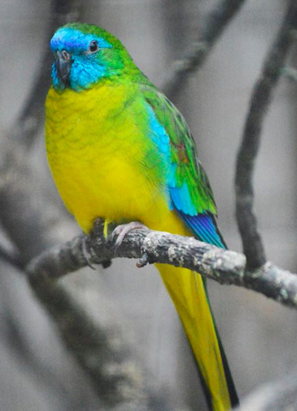 Head and neck: Forehead and face blue; midcrown and nape bluish green; throat yellow; bill small, black.