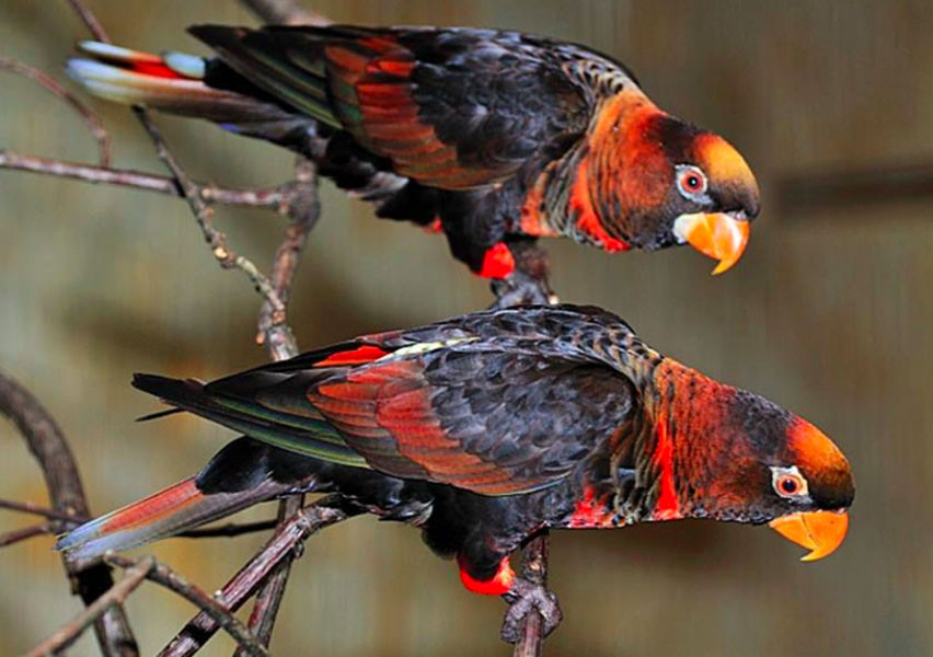 Head and neck: Forehead; front of face, throat, and nape dark greyish brown; crown yellowish orange; bare skin on lower bill orange; neck with yellow orange collar; eye orange; bill orange.