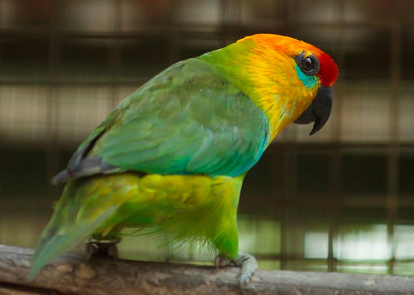 A small, stocky parrot; 18-19 cm TL; 108-126 g; Head and neck: Forehead bright reddish orange; crown orange with yellow wash; face yellow (subsp desmarestii), orange (subsp blythii); below eye light blue patch; nape green; throat yellow; bill black.