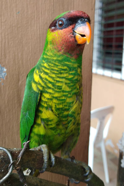 Head and neck: Forehead, face and throat orange red; eye stripe from lore and through eye terminates at nape black; nape green; eye dark brown; cere black; bill orange.