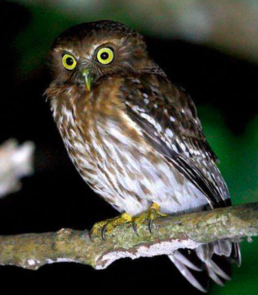A small boobook; 15-20 cm TL. Head and neck: Head brown; no ear tufts; whitish V-shaped eyebrows; rictal bristles greyish; eye orange yellow; bill greenish yellow.