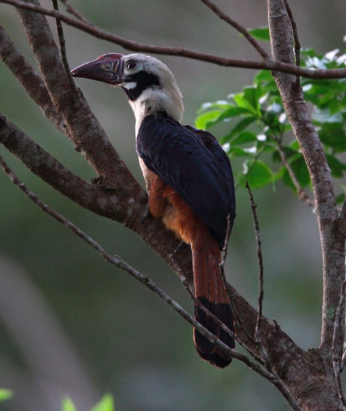 Small hornbill; 45 cm TL; sexes are different; prominent ridged bill. Head and neck: Head, and neck dirty white and washed with pale yellow (male); ear coverts (cheek) and lower throat black; bare skin around eye and on throat white; eye light brown to dark red; casque small with prominent ridges; bill and casque blackish maroon; female black overall except tail.
