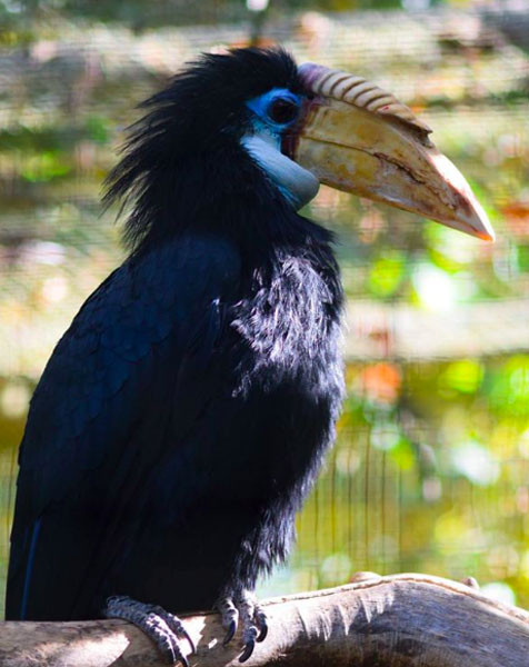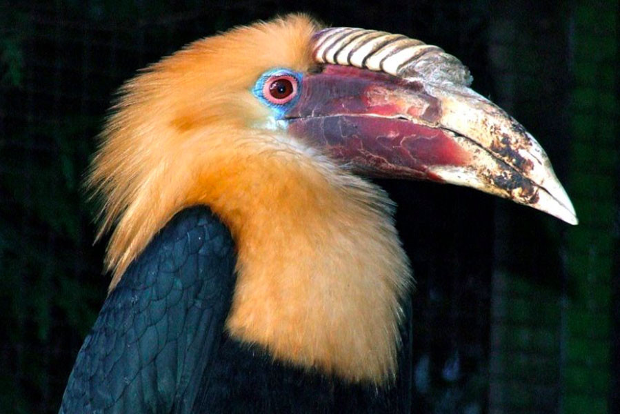 A medium large hornbill; 65-85 cm TL; 1200-2000g. Sexes differ. Head and neck: Head and neck dark reddish brown (male), black (female); low ridged (wreathed) casque yellow and brown; eye and eyering red; bareskin around eye and throat bluish white; bill pale yellow, base dark brown.