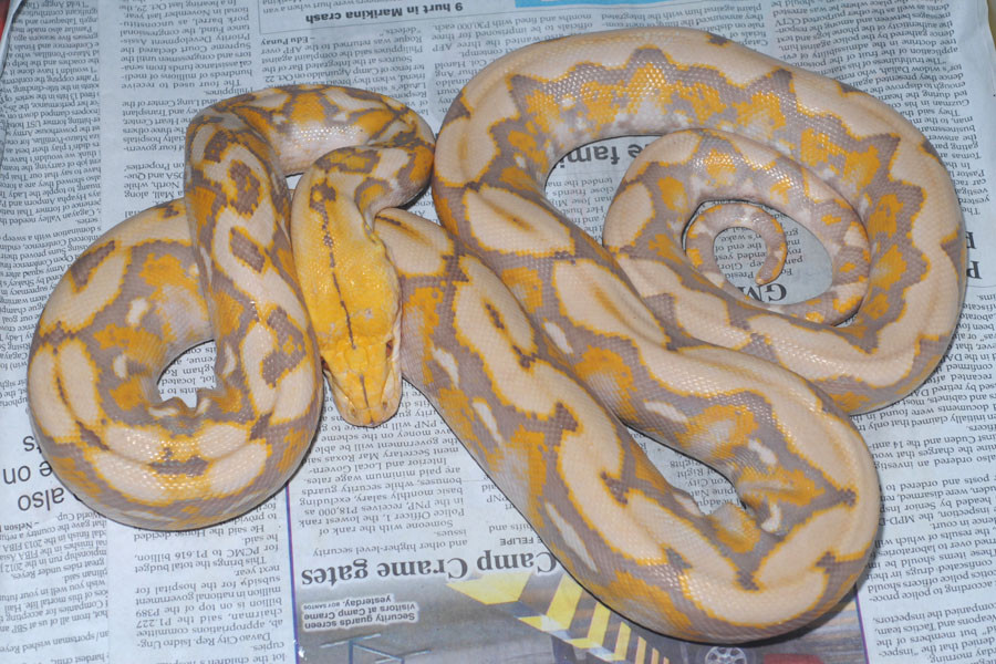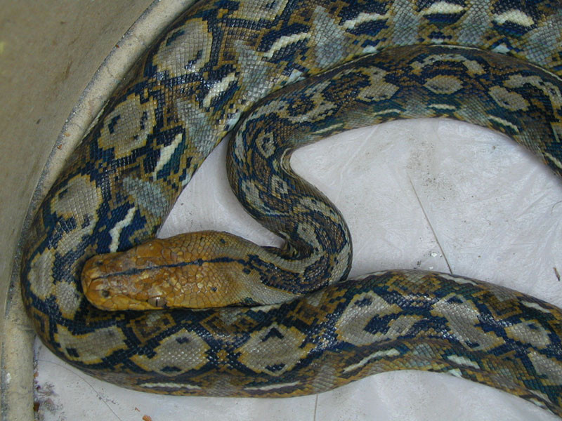 Body: muscular, long; grey, brown or brownish orange; black blotches with base color centers connected, forming a reticulated pattern; black blotches with white horizonal lines on the sides; ventral cream.