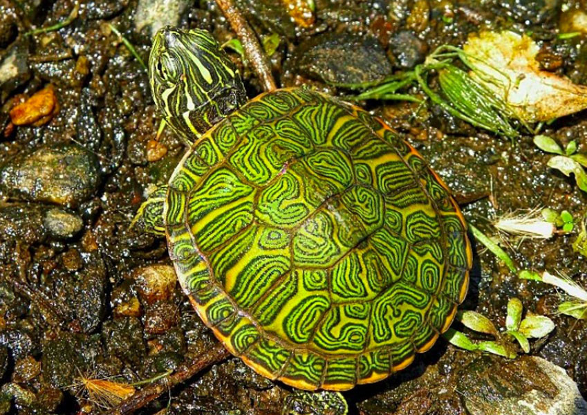 Carapace - Dark greenish grey to brown with yellow markings; elongated and flattened dorsally; marginal scutes slightly serrated posteriorly; five vertebral scutes, third broadest.