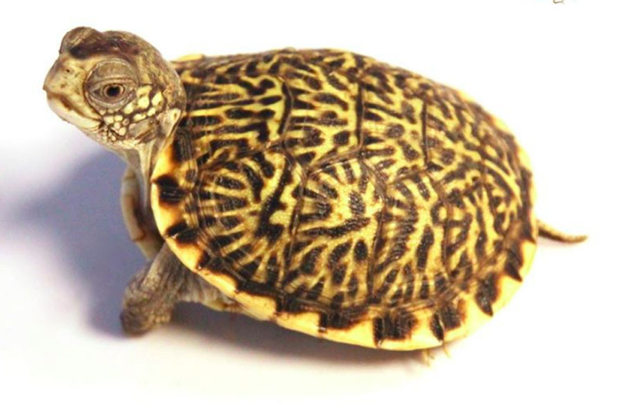 Carapace - Dark brown with broad yellow stripes, high domed, round or oval in shape; usually no keel; each scute has a mid-dorsal yellow stripe and radiating lines; first vertebral scute angled at 45 degrees or less; all vertebral scutes are broader than long.