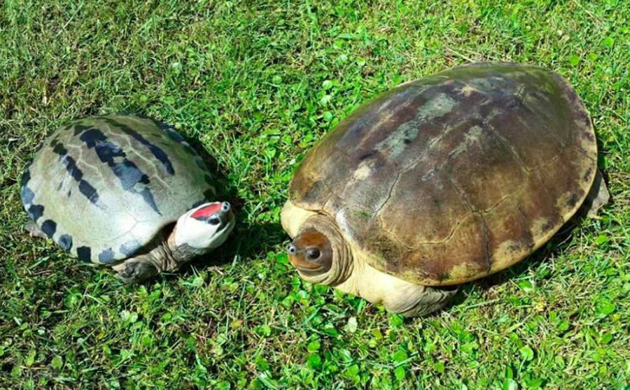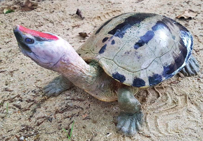 Carapace - light brown to greenish grey, elongated and slightly domed; First to third and fifth vertebral scutes broader than long; fourth as long as broad; during breeding season, color changes occur on adult males; head and neck white; a broad red spot on top of the head; carapace light greenish grey with three black broad lines and black spots on marginals.