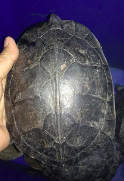 Carapace - Uniform dark brown to black, oval; posterior margin serrated; median keel distinct; two lateral keels less pronounced; first four vertebral wider anteriorly; 5th broader posteriorly.