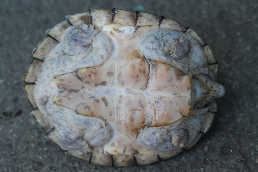 Plastron - gular scute is absent; reduced and weakly hinged; the pectoral scutes are rhomboid in shape; plastron is an immaculate light yellow.