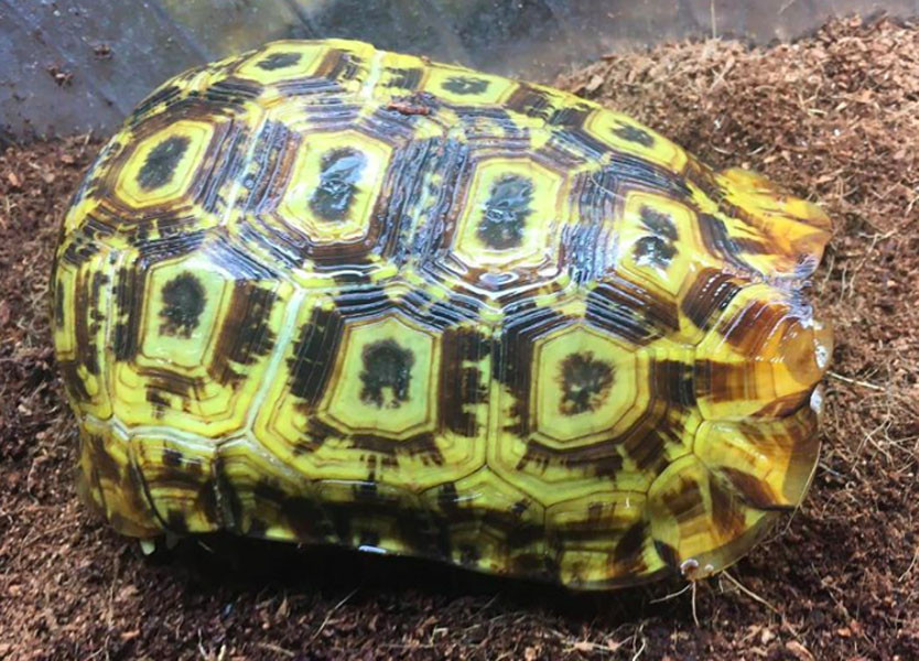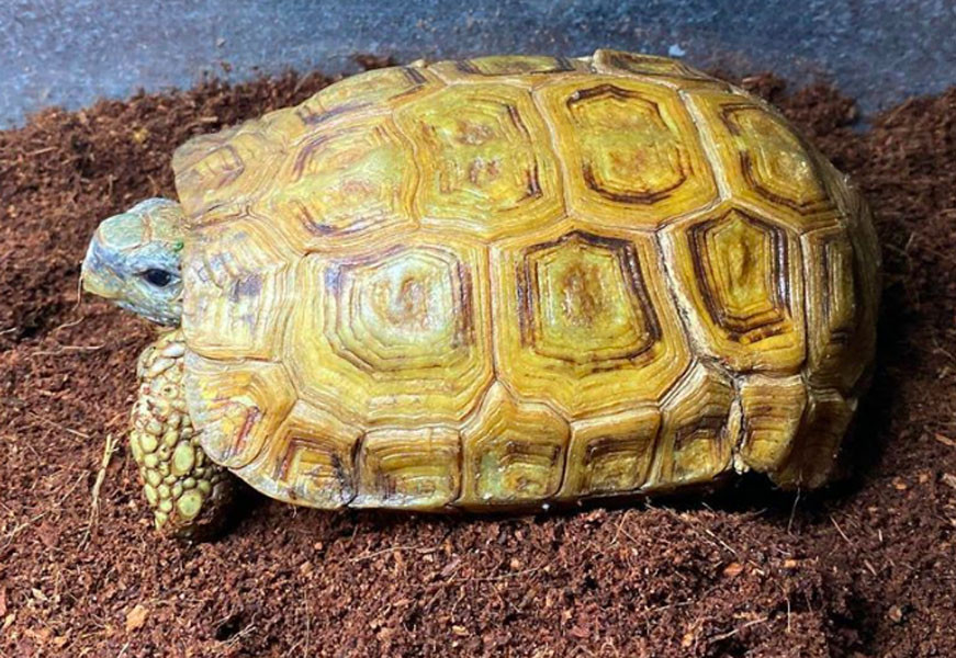 Carapace - uniform brown or with distinct yellow and dark rings; abrupt drop starting on anterior portion of 5th vertebral;domed with a flat dorsal surface; sides sloping; anterior margins may be slightly flared; an elongated cervical scute is present; 2nd to 5th vertebral scutes broader than long; 5th flared; a narrow ridge on ventebral scutes may be present; posterior margins weakly or not serrated; supracaudal undivided; growth rings prominent.