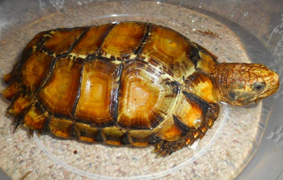 Plastron- yellowish brown with dark seams; gular and anal scutes with notch; gulars thickened and extend slightly beyond the carapacial rim.