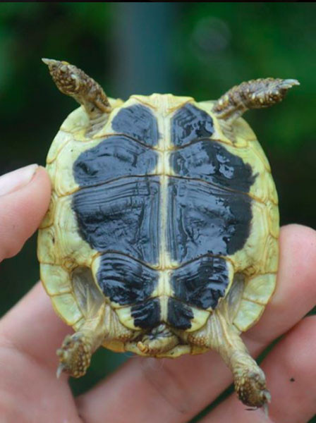 Plastron- dark brown to black with yellow border; a pair of gulars thickened, extends slightly pass carapacial rim; movable hinge between abdominal and femoral scutes
