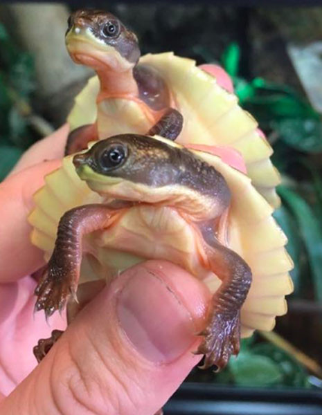 Carapace- uniform dark brown without spots; round to oval in shape; cervical scute absent; vertebral broader than long; 5th smallest; 2nd largest; posterior rim slightly serrated