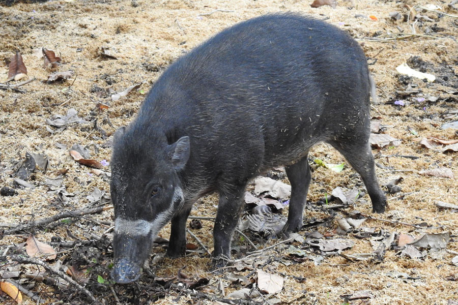 The only wild pig in west Visayan faunal region (Cebu, Guimaras, Masbate, Negros, Panay). Head and neck: dark grey to black; snout pointed; white bristles at base of snout and sides.