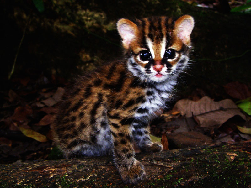 Body: smaller than domestic cats; golden brown fur with brown spots on entire body; abdomen white from chin to the body; main fur coloration varies from light grey to yellowish brown.