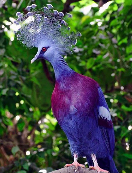 A huge terrestrial pigeon; 66-74 cml 2400 g. Head and neck: Overall coloration is bluish grey; head adorned laterally compressed pale bluish grey lacy crest with white tip; crown and face light grey; eye red; black stripe from base of bill and through eye terminates behind eye; bill grey; throat grey.