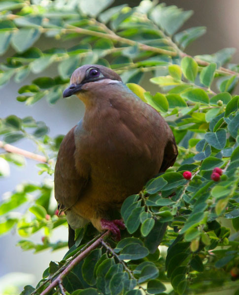 A small dove; 23-24 cm TL; 82-158 g; sexes are alike in appearance. Head and neck: Forehead greyish brown; crown and nape brown; back of neck and upper back iridescent bronze green and purple; black stripe below a white stripe below eye; eye outer ring violet, inner ring pinkish purple; skin around eye bluish green; bill black; throat reddish brown.