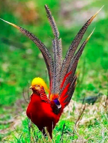 Males with flamboyant plumage and very long tail, females mainly brown with black bars; male 100-115 cm TL; female 61-70 cm TL. Head and neck: Crown golden yellow; nape and side of neck yellowish orange with black bars; bill light yellowish brown; skin around eye yellow; throat red.