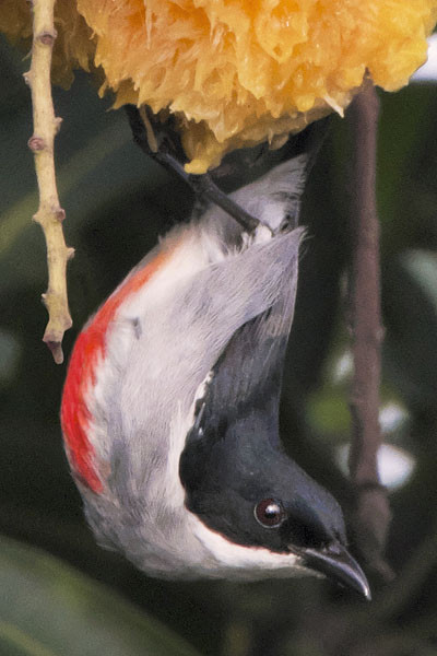 A small bird; 10 cm TL; 9-11g. Head and neck: Head and neck black; eye dark brown; bill black; throat white.