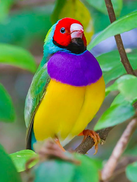 Head and neck: Head variable from black, golden yellow, to red (morphs); crown with light blue band traversing behind cheek to throat; nape green skin around eye pale light blue; eye dark brownbill white with red tip, domesticated strains may be yellow or red; throat black, lower throat with narrow light blue band.