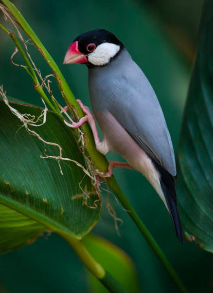 15-16 cm TL; 23-28 g; sexes are alike in appearance Head and neck: Head and throat black; cheek with conspicuous white patch; eye dark red; skin around eye red; bill pink to red.