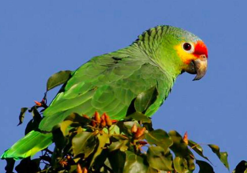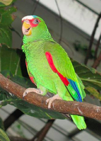Head and neck: Forehead red; crown and nape yellowish green; bare skin on face white or pink (older...