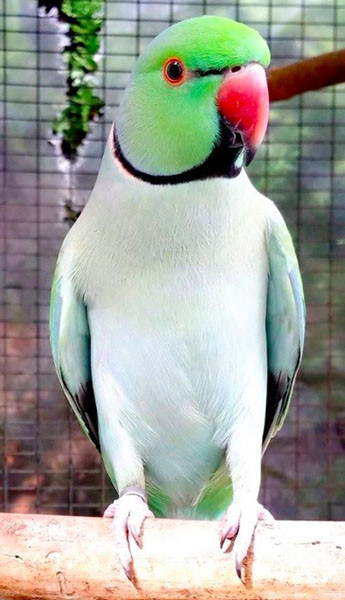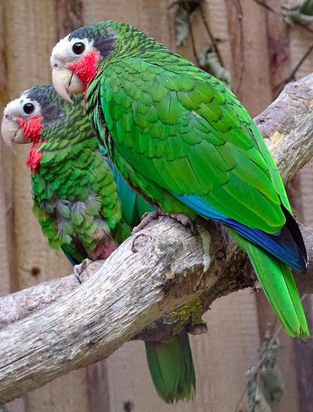 Head and neck: Forehead red; crown and nape green; bare skin on face white or pinkish with lines of ...
