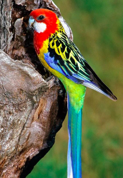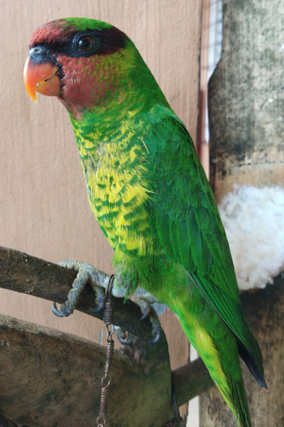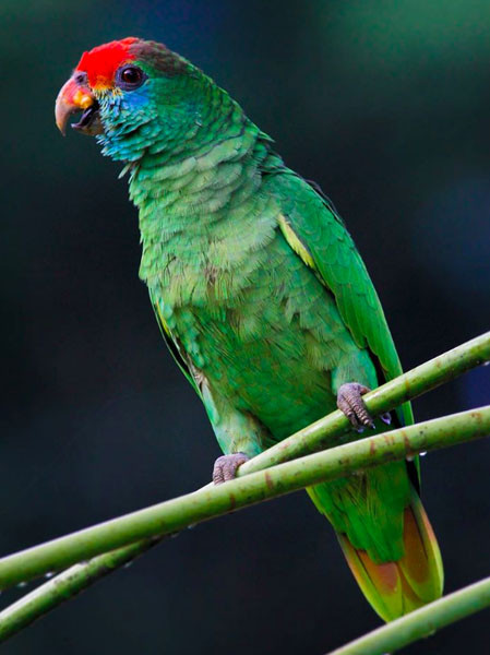 Head and neck: Forehead and lores deep red, diagnostic; crown light blue; nape green; cheek yellow o...