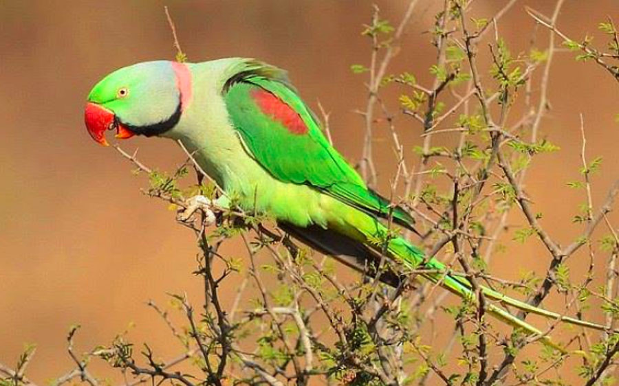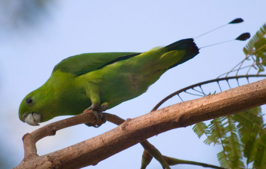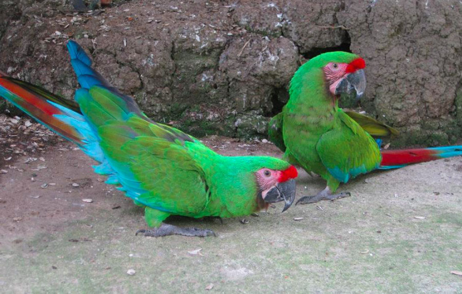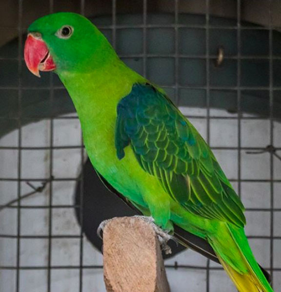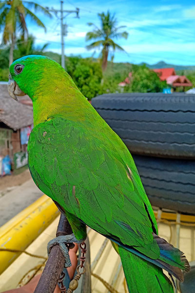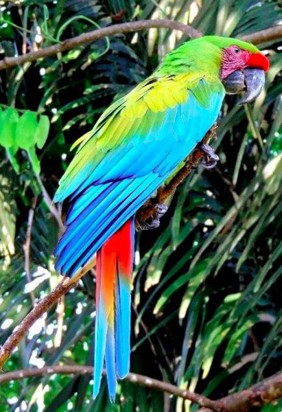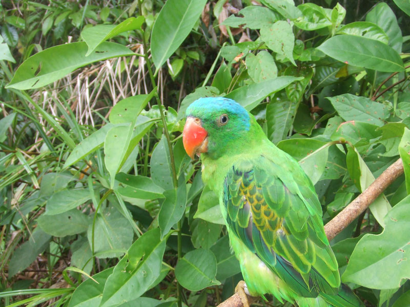 Head and neck: Entire head bright green; bill large, red with orange tip; cere black; eye inner ring...