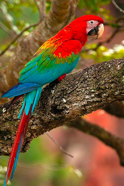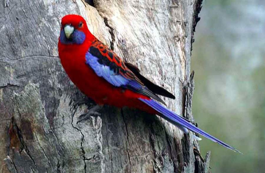 Head and neck: bright red; throat with blue patch; bill white. Body: Predominantly red; back and sc...