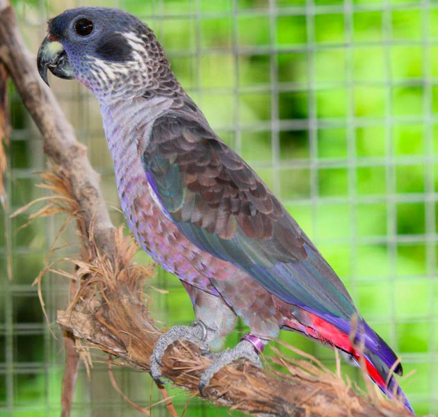 Sexes are alike in appearance. Head and neck: Forehead and crown grey; lore and eyering purpl...