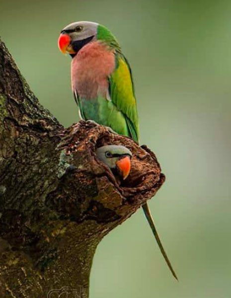 Head and neck: Head yellowish green; nape light blue; hindneck with light pink band; female no blue ...
