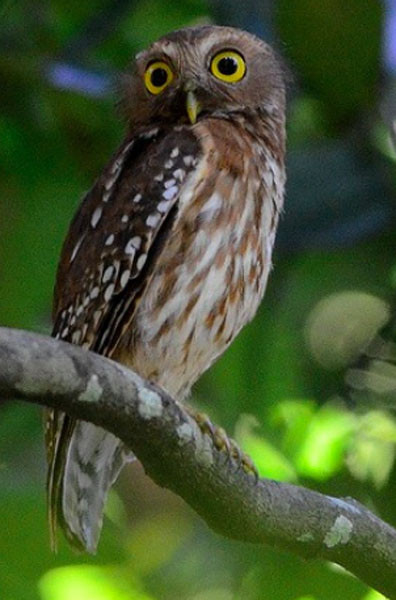 A small boobook; 15-20 cm TL. Head and neck: Head brown; no ear tufts; whitish V-shaped eyebrow...