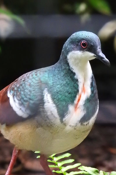Head and neck: Crown, nape, and side of neck iridescent green; eye uncertain color, probably purplis...