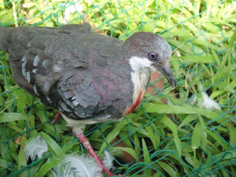 Head and neck: crown, nape and throat blue; bare skin on face white with lines of blue feather; ear ...