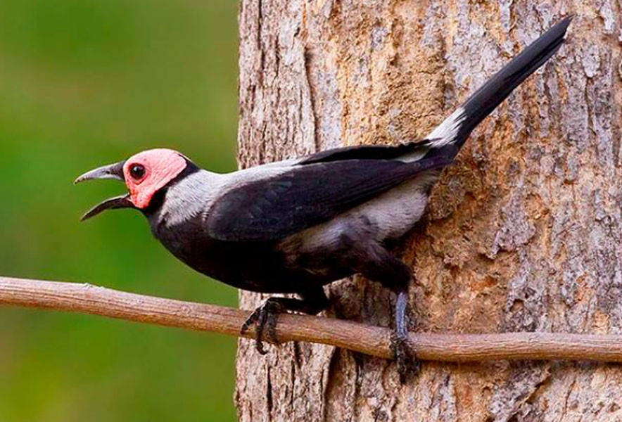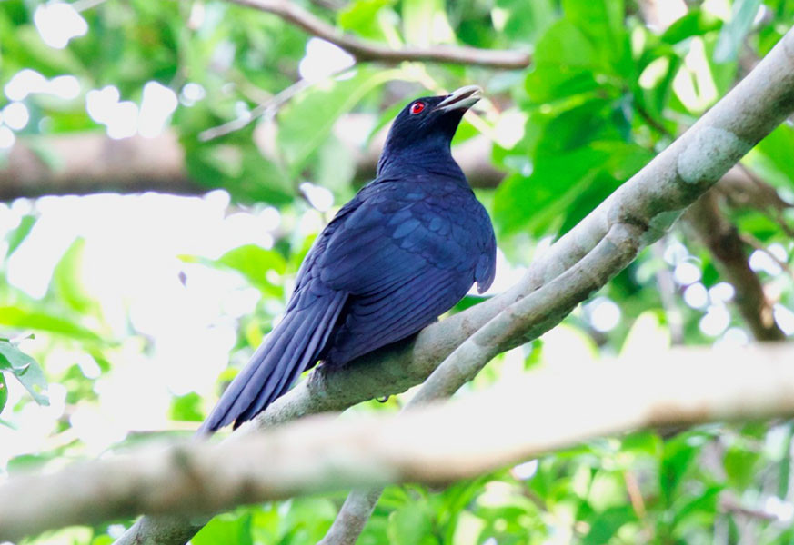 Head and neck: Head glossy black; eye red; bill light green.. Body: Overall glossy black (male); ...