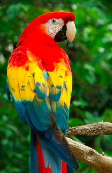 Head and neck: Forehead and around eye red; midcrown yellow; nape green; cheek and throat green with...