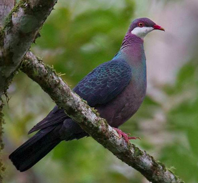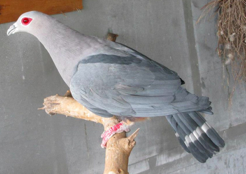 A large pigeon with prominent bare red skin around the eye. Head and neck: Crown li...