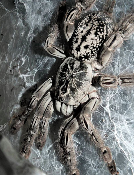 Head and body: light brown to light grey; center of cepalothorax with black marking; abdomen with bl...