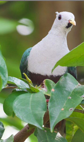 A large fruit dove; 32-33 cm TL; 263 g; sexes are alike in appearance. Head and neck: Forehea...